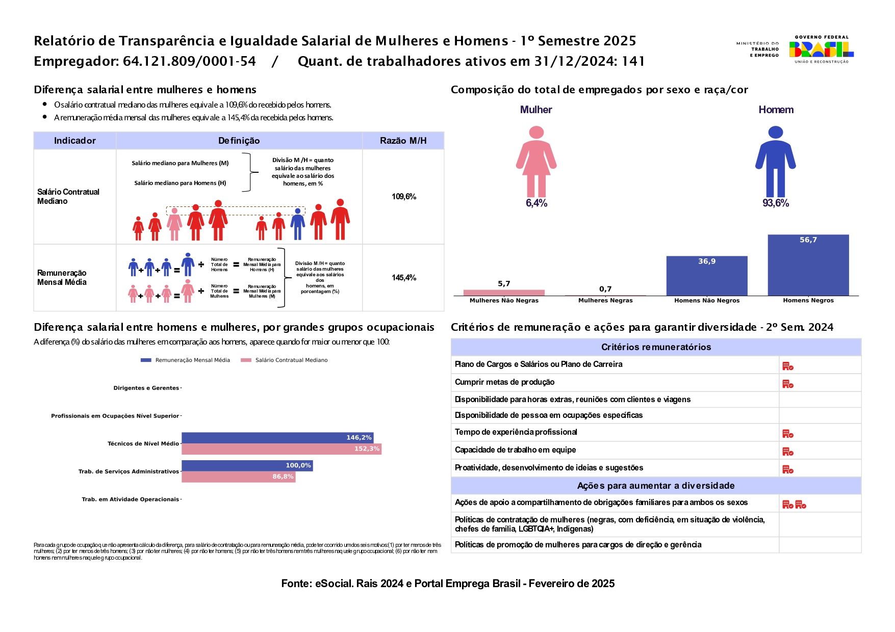 Em atendimento à Lei nº 14.611/2023, de 3 de julho de 2023, conhecida como Lei da Igualdade Salarial, estabelece-se a obrigação de garantir a igualdade de remuneração entre homens e mulheres. Em conformidade com essa lei, empresas privadas com 100 ou mais empregados devem publicar semestralmente o Relatório de Transparência Salarial, observando a proteção de dados pessoais
